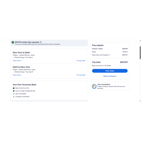 Etihad Airways via Expedia have round trip airfares travelling from New York (JFK) to New Delhi India (DEL) for $674, making 1 stop both ways in Abu Dhabi for a few hours. This is a basic economy fare that only allow a personal item and a carry-on bag. There is no seat selection and no change.