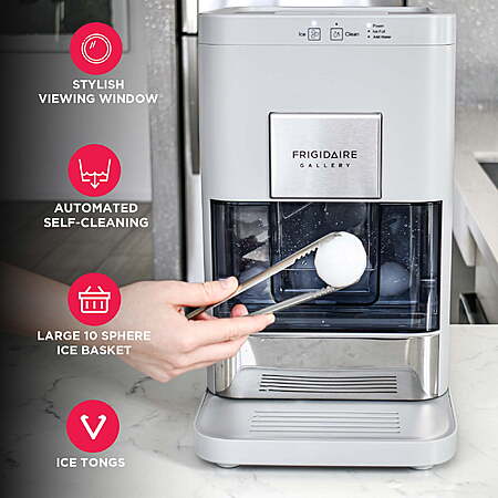 | Product Description: | Upgrade your beverage experience with the Frigidaire Gallery EFIC242 Sphere Ice Maker. This countertop machine creates impressive 2-inch clear ice spheres that melt slowly, ideal for whisky and cocktails. Producing up to 86 spheres daily, it ensures you're always ready to serve. With touch controls, drawer access, and a stainless steel finish, it fits under most cabinets. Simply plug in, add water, and enjoy premium ice without needing a water hookup. Artisanal Sphere Ice - Craft your own unique and elegant artisanal sphere-shaped ice that elevates the drinking experience, making it perfect for special occasions and gatherings. Effortless Touch Control - Tap into intuitive ice-making with our intelligent control panel. Producing up to 86 beautifully crafted ice spheres daily, the first spheres are ready in just 30 minutes. Compact Size - Conveniently sized, this compact ice maker fits under cabinets for seamless countertop placement. Convenient Design - Designed with drawer access and a viewing window, this small sphere ice maker allows you to quickly view ice levels. No water hookup needed—just plug in and fill the reservoir for immediate use. Automatic Self-cleaning - The auto self-cleaning function ensures fresh-tasting ice every time, maintaining optimal hygiene and taste. Sleek And Practical- Designed with a stylish matte exterior, this artisanal ice machine adds sophistication to any kitchen. Complete with an ice scoop and drip tray, this compact ice machine is as practical as it is stylish. Ample Storage - With its 10-sphere ice basket capacity, you'll also always have plenty of ice on hand. Whiskey Enthusiasts - Ideal for whisky enthusiasts, the slow-melting ice spheres preserve the flavors and aroma, allowing you to savor every sip. |