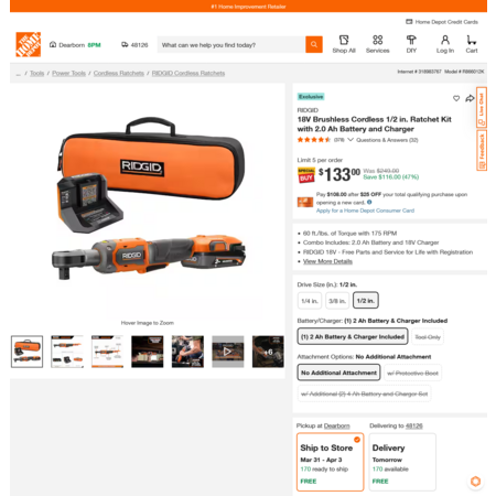 RIDGID 18V Brushless Cordless 1/2 in. Ratchet Kit with 2.0 Ah Battery and Charger $133