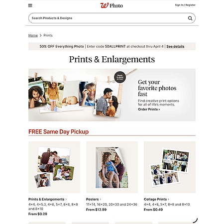 Must use code 50ALLPRINT to receive 50% off Everything Photo through a logged in registered Walgreens.com/Photo online account, in store photo kiosk, or through the Walgreens Mobile App. Code must be entered at time of online, in-store photo kiosk, or mobile checkout to apply discount. Offer expires at 11:59 p.m. CT on April 4, 2026. Timing is determined by Walgreens server clock. Offer excludes Gift Packaging, Document Printing, Passport/ID Photos, Film Processing, Restoration Services and DVD Transfer services. If ordering more than one item, up to three coupons or strike through sale discounts can be used in the online cart. Only one coupon code or strike through sale pricing discount can be applied per item. Account product credits are applied first and cannot be combined with coupon codes or strike through sale pricing. Void if transferred, reproduced or copied and where prohibited by law. Discount does not apply to previous purchases, taxes or shipping charges. Offer is subject to change or cancellation at any time.