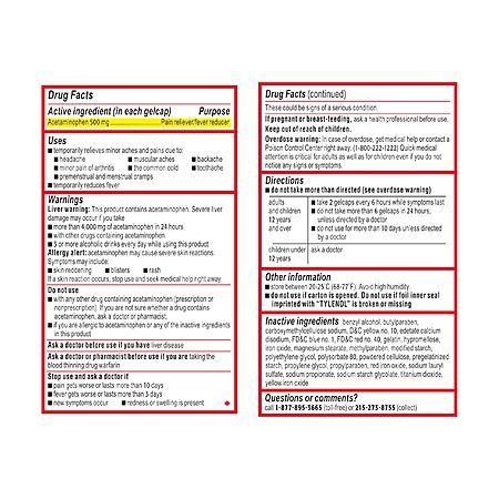 Tylenol Extra Strength Rapid Release Gels are fast-acting over-the-counter medication delivering 500 mg of acetaminophen per gelcap through innovative laser-drilled holes for temporary relief of pain and reduction of fever. These pain relief pills in gelcap form are engineered to release medicine quickly while remaining gentle on the stomach, providing a non-aspirin option for adults and children 12 years and older. Each convenient bottle contains 100 rapid release gelcaps, making it ideal for medicine cabinets at home or travel kits. Tylenol gelcaps temporarily relieve minor aches and pains associated with headache, backache, minor arthritis pain, toothache, menstrual and premenstrual cramps, and common cold-related fever. As the #1 doctor recommended brand for pain relief and fever reduction (based on a survey of doctors, IQVIA 2021), Tylenol combines trusted efficacy with reliable quality. For use, adults and children 12 years and older take two gelcaps every six hours while symptoms last, and do not exceed six gelcaps in 24 hours. This extra strength acetaminophen formulation supports busy lifestyles with dependable, gentle relief. The over-the-counter gelcap format dissolves easily, acting as an effective fever reducer while ensuring reliable performance dose after dose, and the 100-count bottle offers long-lasting value so you maintain relief on hand when pain strikes. Whether you need rapid headache relief before a meeting, soothing backache support after exercise, or fever reduction to rest comfortably, Tylenol Extra Strength Rapid Release Gels deliver consistent performance you can trust. Keep Tylenol at your side for trusted relief wherever life takes you.