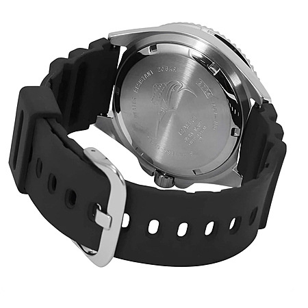 - Case: 44mm wide, 12mm thick solid stainless steel with anti-reverse one-way rotating bezel and textured screw-down crown