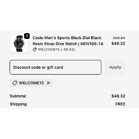 44mm Casio Men's Sports Black Dial & Resin Strap Dive Watch (MDV106-1A) on sale for $56.84 - $8.52 with discount code
