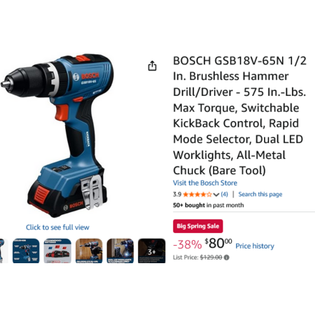 Model: BOSCH GSB18V-65N 1/2 In. Brushless Hammer Drill/Driver - 575 In.-Lbs. Max Torque, Switchable KickBack Control, Rapid Mode Selector, Dual LED Worklights, All-Metal Chuck (Bare Tool)