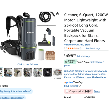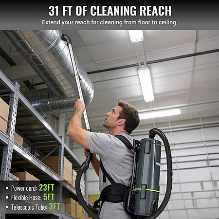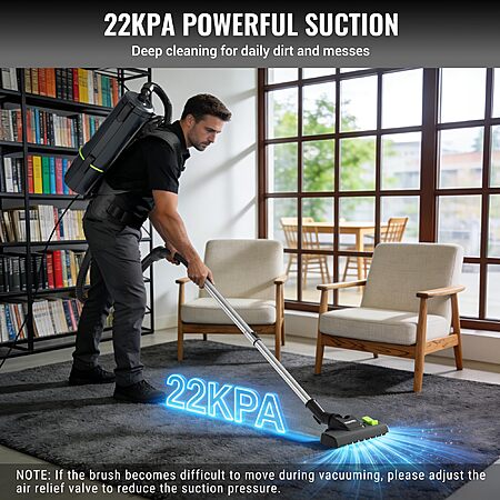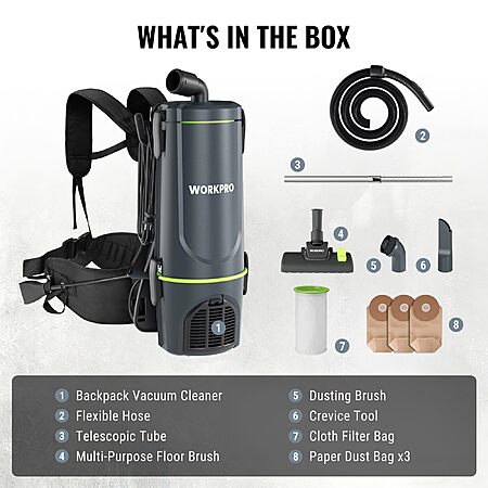 WORKPRO Commercial Backpack Vacuum Cleaner, 6-Quart, 1200W Motor, Lightweight with 23-Foot Cord. YMMV - Coupon Price $249.99