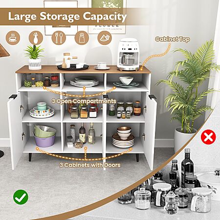 • [Large Storage Capacity]: This kitchen storage cabinet consists of a wide cabinet top, 3 open compartments, and 3 enclosed cabinets with doors. It provides ample storage space for your home appliances, condiments, food, and others.
