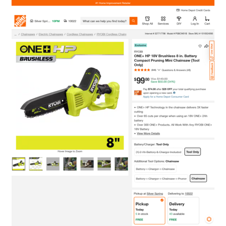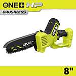 | Product Description: | The 18V ONE+ HP Compact 8" Pruning Chainsaw is engineered with ONE+ HP Technology which combines a powerful brushless motor, advanced electronics, and high-performance lithium technology to deliver 3X faster cutting. Equipped with an 8" bar and chain, this tool can tackle branches up to 6", making it ideal for pruning and light limbing. With over 65 cuts per charge and a premium full house chain, the pruning chainsaw delivers longer runtime and faster cutting. This pruning chainsaw is 30% more compact, allowing you to go where other chainsaws can't, getting into tight, hard-to-reach spaces. Experience exceptional performance with just the pull of a trigger, without the hassle of gas or cords. Using the combination wrench conveniently stored on the tool, precisely adjust the chain to the desired tension. The oil-free design provides the ultimate convenience, eliminating the hassle and mess of continuously having to apply bar and chain oil. The pruning chainsaw is equipped with multiple safety features such as the chain & handle guards that ensure every cut is a safe cut. The variable speed trigger gives you maximum control during any application. Best of all, it is part of the RYOBI ONE+ system where any 18V ONE+ battery works with any 18V ONE+ product. This saw is backed by the RYOBI 3-Year Manufacturer's Warranty and includes the PSBW01 18V ONE+ HP Compact 8" Pruning Chainsaw, Scabbard, Combination Wrench, and Operator's Manual. |