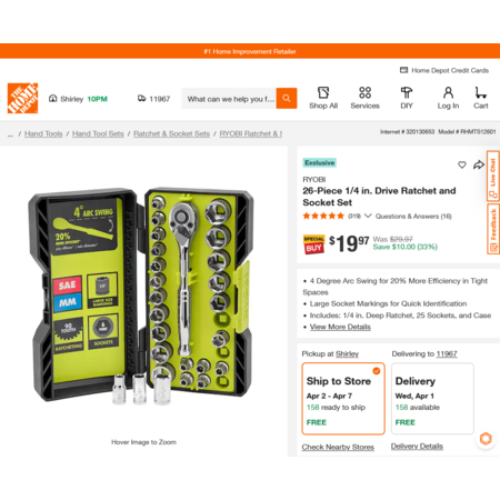 RYOBI 26-Piece 1/4 in. Drive Ratchet and Socket Set $19.97