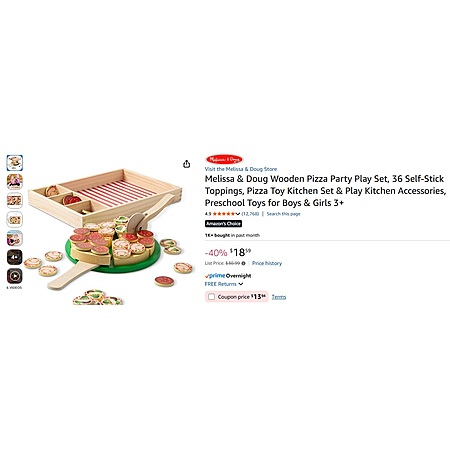Melissa & Doug Wooden Pizza Party Play Set, 36 Self-Stick Toppings, Pizza Toy Kitchen Set & Play Kitchen Accessories $13.94 w/coupon +FS w/Prime