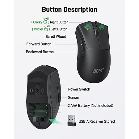 Model: Acer - Ergonomic Mouse Wireless, Vertical Computer Mouse for Office, Ergo Mice Rechargeable for Right Hand, 2.4GHz USB Rec - Wireless - Black
