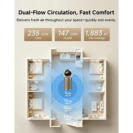 - World's First Smart Dual-Flow Air Purifier: Dreame's Dual-flow Tech boosts air purification efficiency by 33%. The upward and forward air outlets deliver 253 CFM of clean air—covering up to 1,883 ft² quickly and evenly.