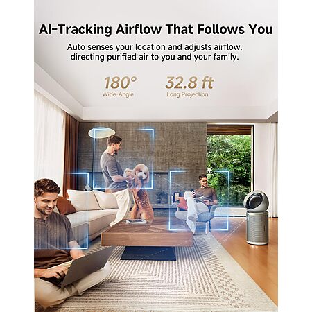 - World's First Al-Powered and Tracking Air Purifier: Built-in radar detects movement without delay and auto-adjusts airflow direction within a 32.8 ft range and 180° coverage, even directing air between multiple people.