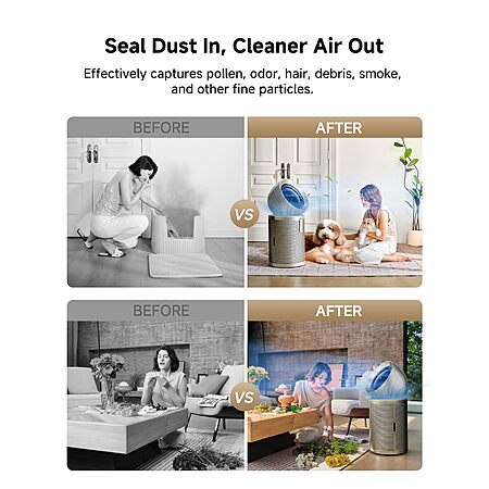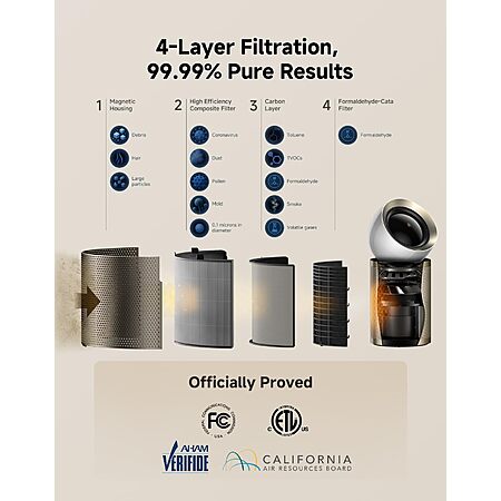 - 4-Layer Filtration for 99.99% Clean Air: Captures particles as small as 0.1μm, and cleans 99.99% of dust, pet dander, pollen, smoke, and more—targeting up to 14 indoor pollutants for healthier air.