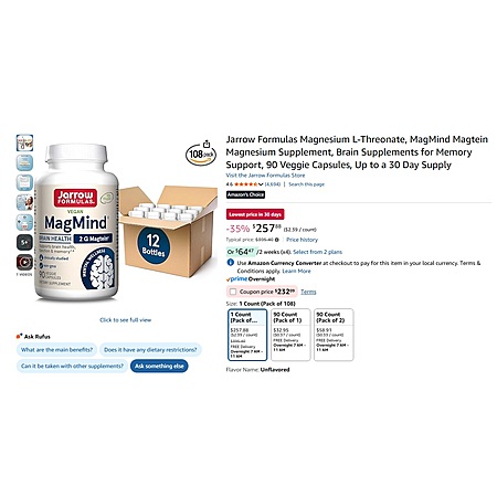 Pack of 108: Jarrow Formulas Magnesium L-Threonate, MagMind Magtein Magnesium Supplement, Brain Supplements for Memory Support, 90 Veggie Capsules [amazon.com] $232.09 w/coupon