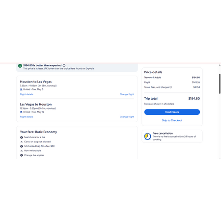 Southwest Airlines, United Airlines and Expedia have round trip airfares travelling to and from Houston (IAH) and Las Vegas (LAS) for $185 nonstop. These are basic economy fares. On United you may have a personal item. On Southwest you may have a personal item and a carry-on bag.