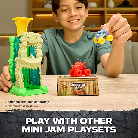 - 28-Inch Jungle Adventure: Launch into wild Monster Jam mayhem, power up the motorized launcher and send your Mini Monster Trucks flying through a looping jungle track that's over 2-foot-long