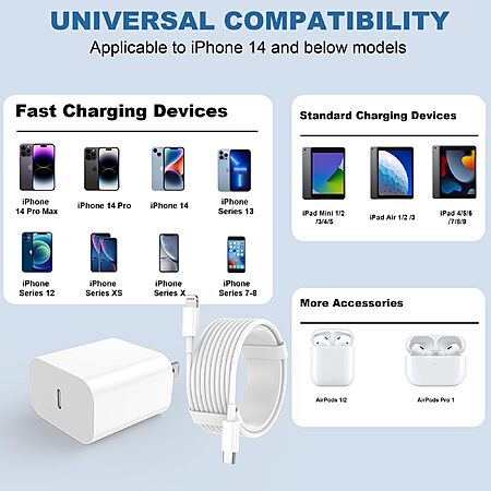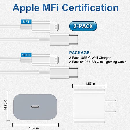 iPhone Charger Fast Charging 2 Pack Type C Wall Charger Block with 2 Pack [6FT&10FT] Long USB C to Lightning Cable for iPhone 14/13/12/12 Pro Max/11/Xs Max/XR/X,AirPods Pro $7.99