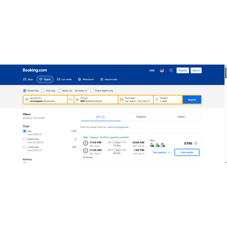 Fiji Airways via Booking.com have round trip airfares travelling from Los Angeles (LAX) to Brisbane, Australia (BNE) for $798, making 1 stop in Fiji both ways for 2-5 hours. There are flights that will make a 26 hour stop in Fiji if you want to see Fiji for a day. These are Fiji Lite fares that only include a personal item, a carry-on bag and 1 free checked bag. Seat selection and changes are allowed for an additional fee.