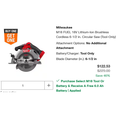 3. Either return or don't pickup the Milwaukee M18 18-Volt Lithium-Ion High Output Battery Pack 6.0Ah and you end up with the Milwaukee M18 FUEL 18V Lithium-Ion Brushless Cordless 6-1/2 in. Circular Saw (Tool-Only) for $122.53.