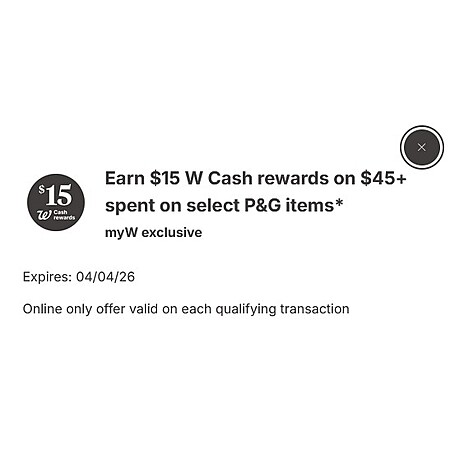 • Earn $15 W Cash rewards on $45+ spent on select P&G items*