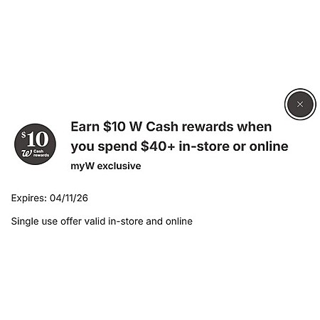 • Earn $10 W Cash rewards when you spend $40+ in-store or online