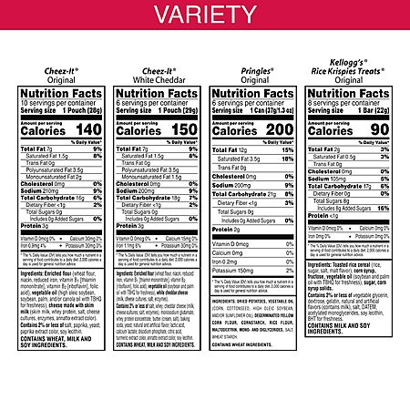 - Variety pack includes Cheez-It Original, Cheez-It White Cheddar, Pringles Original, and Rice Krispies Treats Original snacks