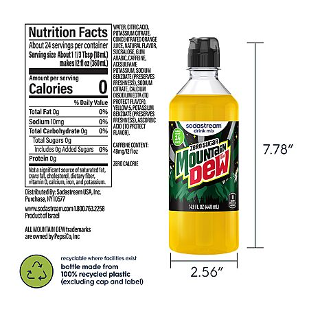 Features:- Includes: (4) 440ml SodaStream MTN Dew Zero, Drink Mix. 14.9 Fl Oz (Pack of 4)
