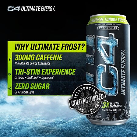 $20.99: C4 Ultimate Frost Zero Sugar Energy Drink with 300mg Caffeine + TeaCrine + Dynamine, Tropical Tundra Frost, 16oz (Pack of 12)