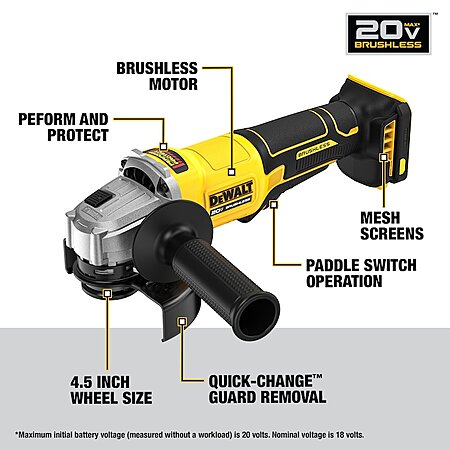 Lowes [lowes.com] has DEWALT 20V MAX brushless 4.5" Paddle Switch Angle Grinder w/2-Pack Batteries (2Ah & 4Ah) on sale for $179. Shipping is free.