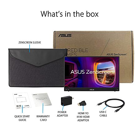 Model: ASUS ZenScreen 16” (15.6 inch viewable) 1080P USB-C Portable Monitor (MB16AHV) - Full HD, IPS, Blue Light Filter, Anti-glare, Mini HDMI, Kickstand, Tripod Mountable, Protective Sleeve, 3 year warranty