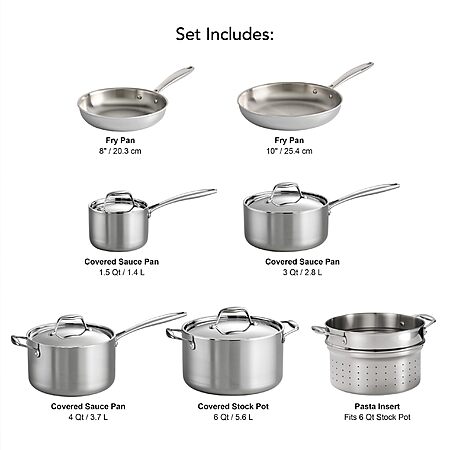 • 11-Piece Set Includes: 2 Frying Pans (8" and 10"), 3 Sauce Pans with lids (1.5-qt, 3-qt and 4-qt), a 6-qt Stock Pot with lid, and a Pasta Strainer Insert designed to fit perfectly into the 6-qt stock pot.