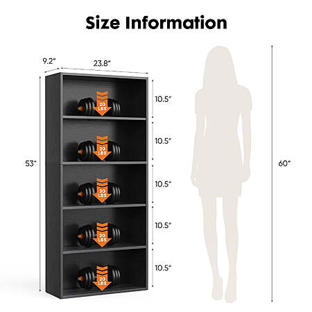 - Storage Space]- Never worry about storage space again with our 5 tier bookcase measuring 9.2"D x 23.8"L x 53"H. Each 10.5" high layer is perfect for organizing your belongings.