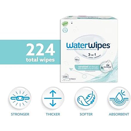 Model: WaterWipes On The Go Wipes, 99.9% Water-Based Wipes for Travel, Sports, and to Refresh Skin, Unscented & Hypoallergenic, 224 Count (8 Packs)