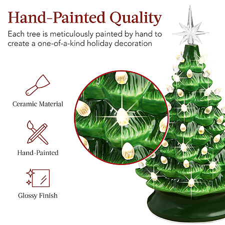 | Product Description: | Add a touch of sparkle to your holiday decor with a charming tabletop accent. Our 15in Hand-Painted Ceramic Tree shines with glowing lights to fill your space with cheer, while the glossy finish highlights its hand-painted details. Made from durable ceramic, it's timeless, easy to clean, and ready to spread holiday joy in the office, on your coffee table, in the living room, and more! HAND-PAINTED FINISH: This mini ceramic Christmas tree is the perfect addition to your holiday decor, beautifully hand-painted with a glossy finish LIGHTS & STAR DECORATION: Decorated with 64 festive White, Multicolor, Red and White, or 2-in-1 White and Multicolor light bulbs and two 7 pointed star toppers to brighten up your holidays (Note: SKY3037 comes with one star topper) 5FT POWER CORD: No need for batteries with the built-in 5-foot power cord and simple on/off switch COMPACT SIZE: Perfectly sized, small enough to fit on any countertop, table, desk, or fireplace mantel VERSATILE DECOR: Ideal for decorating homes, offices, or even classrooms with a little holiday cheer; OVERALL DIMENSIONS: 8.5"(Dia) x 15"(H) |