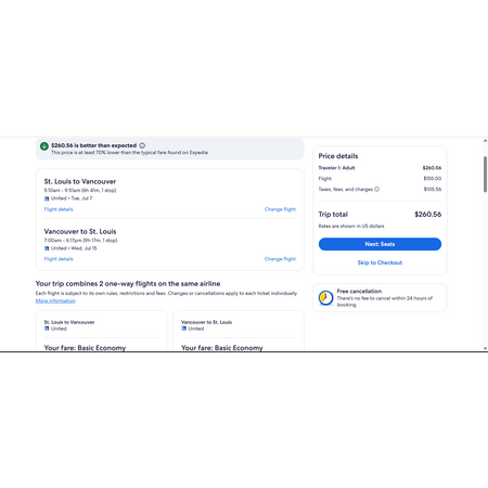 United Airlines and Expedia have round trip airfares travelling from St Louis (STL) to Vancouver BC Canada (YVR) for $261, making 1 stop both ways. These are basic economy fares that allow a personal item. There is no seat selection, no carry-on bag and no change.