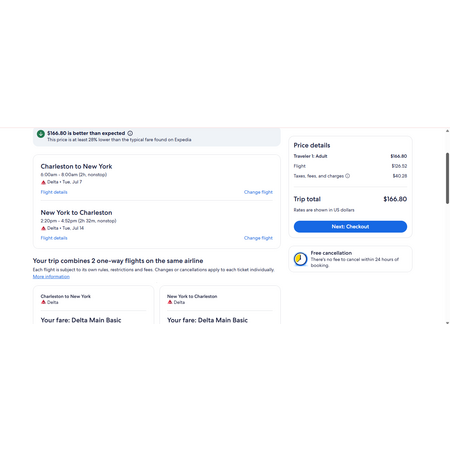 Delta Air Lines, JetBlue and Expedia have round trip airfares travelling to and from Charleston (CHS) and New York (JFK) for $167, nonstop. These are basic economy fares, a restricted-type fare. You're allowed a personal item and a carry-on bag. If you are travelling on JetBlue with children, you will be seated together.