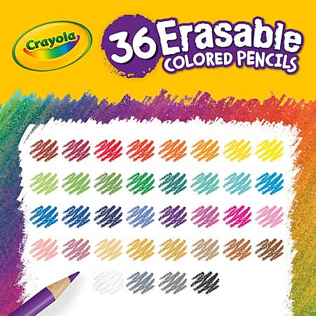 - CRAYOLA ERASABLE COLORED PENCILS: Includes 36 Erasable Crayola Colored Pencils in a resealable box.
