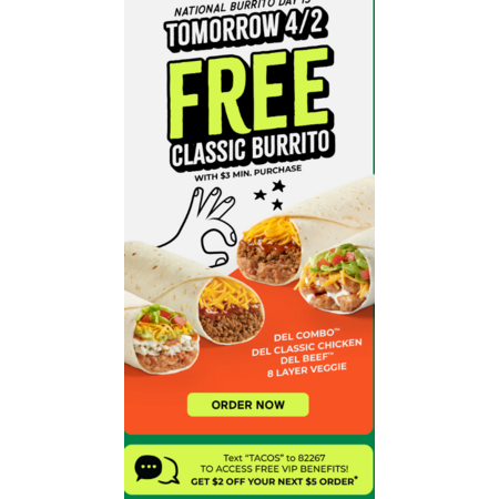 Free Classic Burrito with a $3 minimum purchase. Mix & Match not included. Additional toppings or modifications may incur extra charges. Offer valid Thursday, 4/2/2026 only. Del Yeah!™ Rewards registration required to access deal. Available only on orders placed or scanned with the Del Yeah!™ Rewards app or at deltaco.com. Must save and select offer prior to redemption. Limit one offer per guest. Not valid with any other offer, discount, or coupon. No cash value. Price and participation may vary. Not valid with 3rd Party delivery providers or catering orders.