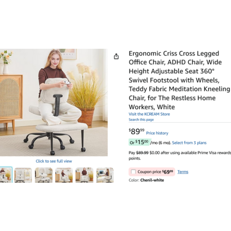 Ergonomic Criss Cross Legged Office Chair, Wide Height Adjustable Seat 360° Swivel Footstool w/Wheels, White. YMMV - Coupon Price $69.99