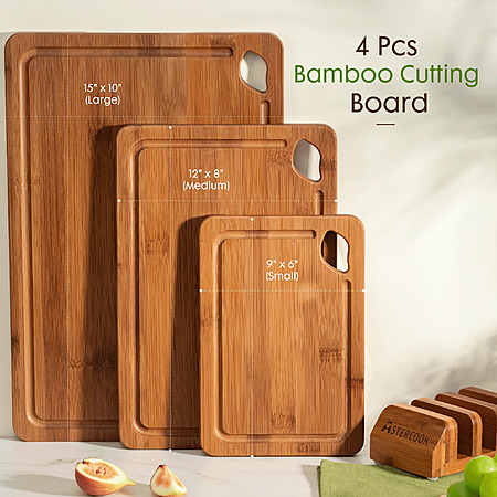 | Product Description: | Crafted for the Kitchen You Love – From Prep to Presentation Our premium deep carbonized bamboo cutting board set isn’t just for slicing and dicing – it’s for creating moments. From prepping fresh vegetables for a weeknight dinner to serving a charcuterie spread at your weekend gathering, these boards bring style, function, and natural beauty to every meal. Brand: Astercook Specification: 4 Pcs Cutting Board Set Material: 100% Bamboo Features: Deep Carbon Technology Item dimensions: 15.3"D x 10.2"W x 3.1"H Item Weight: 4.7 Pounds From Meal Prep to Presentation: Three perfectly sized bamboo cutting boards (large, medium, and small) give you the right tool for every kitchen moment – from slicing a juicy steak to serving a colorful cheese platter. The included holder keeps them organized, easy to grab, and always ready for action. Deep Carbonized Beauty & Strength: Our bamboo is heat-treated at high temperatures for a rich, dark finish that turns heads on your countertop. This carbonization not only enhances the natural grain but also increase hardness, so your boards stay warp-free, crack-free, and beautiful for years. Keep Your Counters Clean: Deep juice grooves run the perimeter of each board, catching every drop from ripe tomatoes or roasted meats. Built-in handles make moving from kitchen to table effortless – whether you’re cooking for family or serving friends. Safe for Your Food, Gentle on Your Knives: Crafted from 100% food-safe bamboo with no harmful coatings. The smooth, knife-friendly surface helps keep your blades sharp, so you can chop, slice, and carve with confidence day after day. Versatile & Gift-Ready: From weekday dinners to weekend gatherings, these boards double as stunning serving trays and charcuterie boards. Packed in gift-ready style, they make a thoughtful present for weddings, housewarmings, or any food lover who values both beauty and function. |
