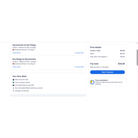 Alaska Airlines, Southwest Airlines and Expedia have round trip airfares travelling to and from Sacramento (SMF) and San Diego (SAN) for $117, nonstop. These are basic economy fares, a restricted-type fare that allows a personal item and a carry-on bag. There is no more free checked bag.