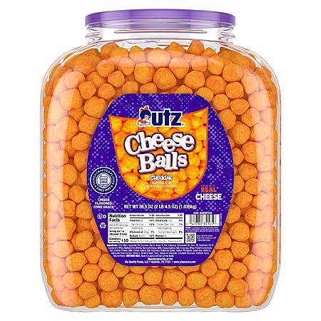 Model: Utz Cheese Balls Barrel, Tasty Snack Baked with Real Cheddar Cheese, Delightfully Poppable Party Snack, Gluten, Cholesterol and Trans-Fat Free, Kosher Certified, 36.5 Oz