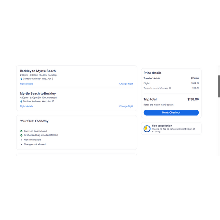 Contour Airlines, a regional premium low-fare air carrier (offering free checked bag and complimentary refreshment service) have airfares travelling to and from Beckley WV (BKW) and Myrtle Beach SC (MYR) for $69 one-way or $138 round trip, nonstop. These introductory airfares are economy fares that include a carry-on bag and a free checked bag. Travelers can also book connections with Contour's interline partners; Alaska, American, JetBlue, and United Airlines.
