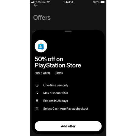 Go to search on cash app -> search for "offers" -> go to quick links -> select "offers" -> add PlayStation 50% offer ($50 max) -> use cash app pay at check of PlayStation Store.