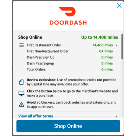 Capital One Venture X has a shopping offer for 14,400 points (easily worth $144) for your first DoorDash purchase. Appears to be valid for new accounts only and/or first DoorDash purchase using your Venture X credit card. There does not appear to be any mention of a minimum purchase.