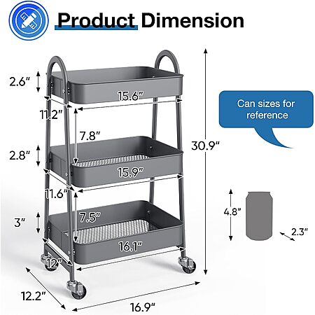 OLIXIS Metal 3 Tiers Utility Rolling Cart, Gray $17.98 Amazon FS Prime or at $35