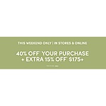 Ann Taylor 40% OFF* YOUR PURCHASE + EXTRA 15% OFF* $175+ This Weekend Only in Store and Online
