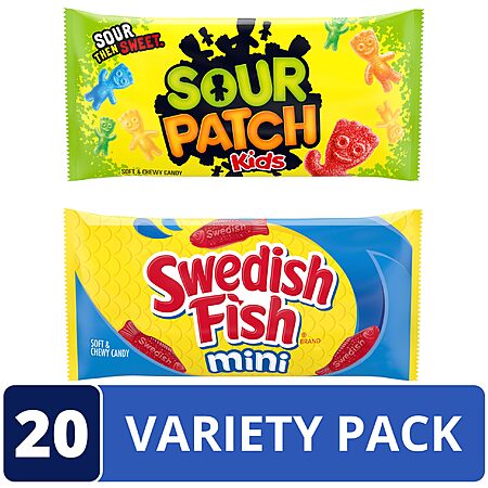 Features:- One variety pack with 10 snack packs each of SOUR PATCH KIDS and SWEDISH FISH Mini Soft & Chewy Candy (20 total packs)