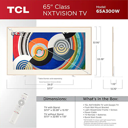 65" TCL 55 Inch Class NXTVISION Series Picture Frame Canvas Art TV w/ Ultra Matte Screen & Flush Wall Mount $799.99 + Free Shipping