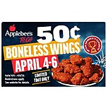 From Apr 4 - 6, Applebee's will offer 50¢ Boneless Wings available for takeout or delivery through Applebees.com or the mobile app.